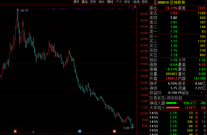 盘面上,豆神教育今日跌0.51%,报收于7.78元,股价较去年7月份26.75元的高点已下跌近70%。
