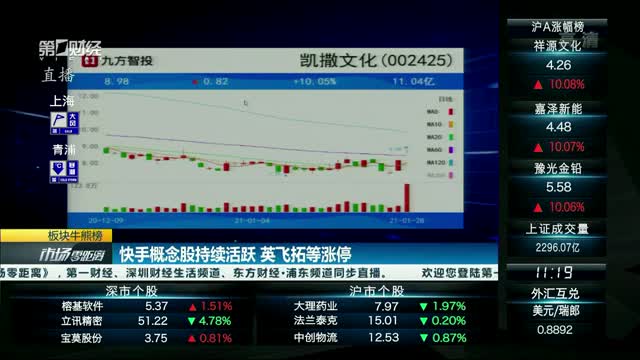 快手概念开盘持续活跃,英飞拓等涨停,凯撒文化等个股纷纷跟涨。消息面上,快手认购持续火爆,实际认购已超211倍冻结2232亿港元,预计超购将达634倍。