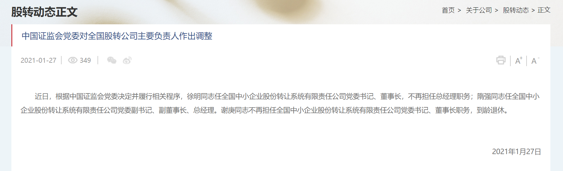 据股转公司官网27日晚间公告,徐明任全国股转公司党委书记、董事长,不再担任总经理职务;隋强任全国股转公司党委副书记、副董事长、总经理。谢庚不再担任全国股转公司党委书记、董事长职务,到龄退休。