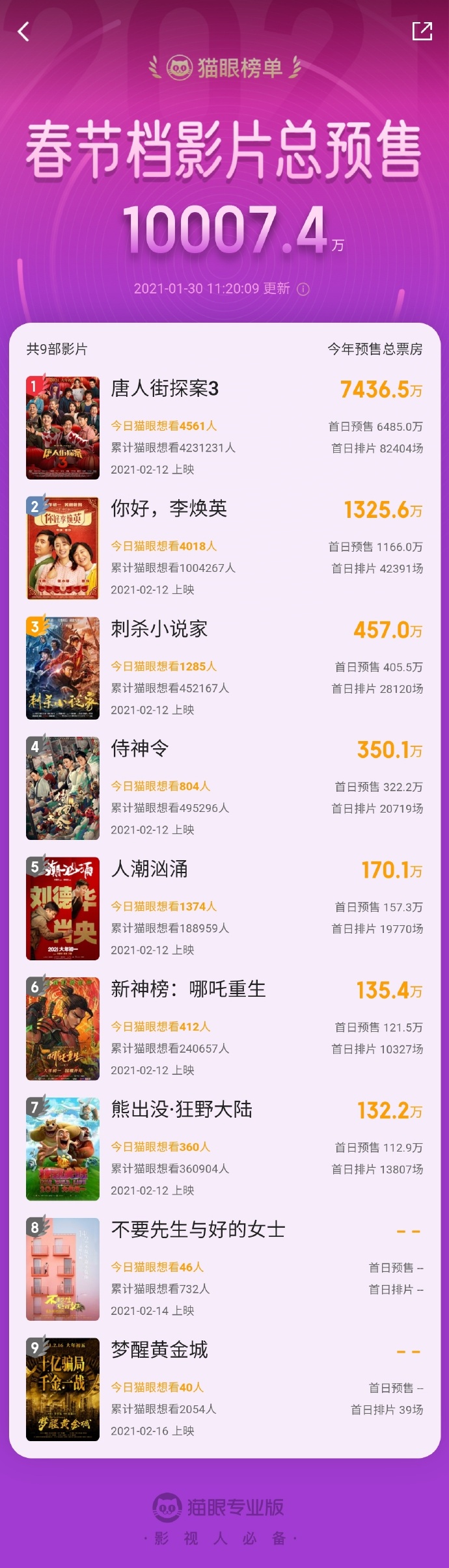猫眼榜单实时数据显示,2021年春节档影片预售总票房已突破1亿。