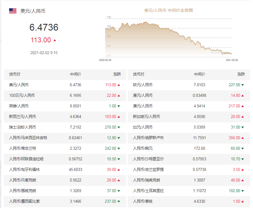 中国外汇交易中心公布数据显示,2月2日,人民币兑美元中间价报6.4736,调贬113个基点。前一交易日中间价报6.4623,在岸人民币16:30收盘价报6.4641,23:30夜盘收报6.4682。