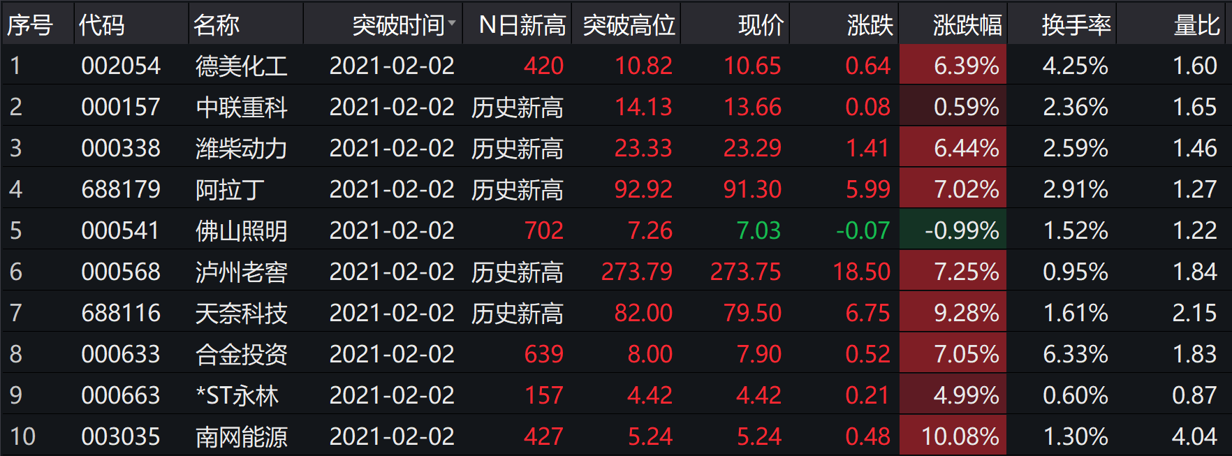 截至午盘,72只个股创盘中新高,其中泸州老窖收涨7.25%,盘中股价一度达273.79元/股,成交额超35亿元,市值超4000亿元。中联重科、潍柴动力、阿拉丁盘中突破历史高位。南网能源午盘涨停,再次达到5.24元/股历史高位。