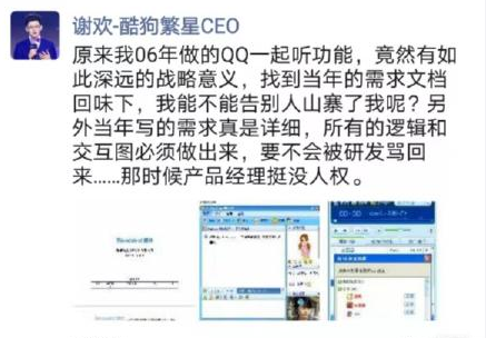 随后,酷狗音乐副总裁谢欢发朋友圈疑似回应,“原来我06年做的QQ一起听功能,竟然有如此深远的战略意义,找到当年的需求文档回味下,我能不能告别人山寨了我呢?另外当年写的需求真是详细,所有的逻辑和交互图必须做出来,要不会被研发骂回来......那时候产品经理挺没人权。”