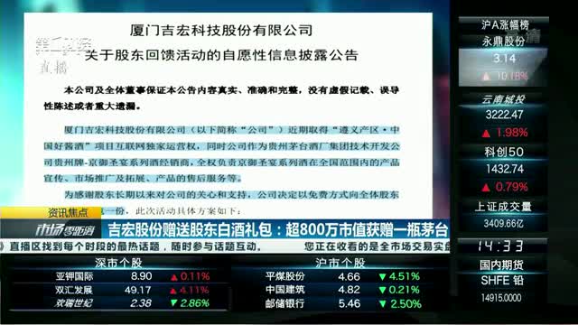 2月1日,A股投资者终于迎来了一份重磅又稀缺的礼物:飞天茅台。这份礼物将由上市公司吉宏股份送出。不过,获取这份礼物的门槛有点高——得持有该上市公司超过800万元市值的股票。消息一出,股吧网友们又炸开了锅。有网友调侃:“我有800万还在乎你瓶酒。”“我缺的不是茅台,是800万”。