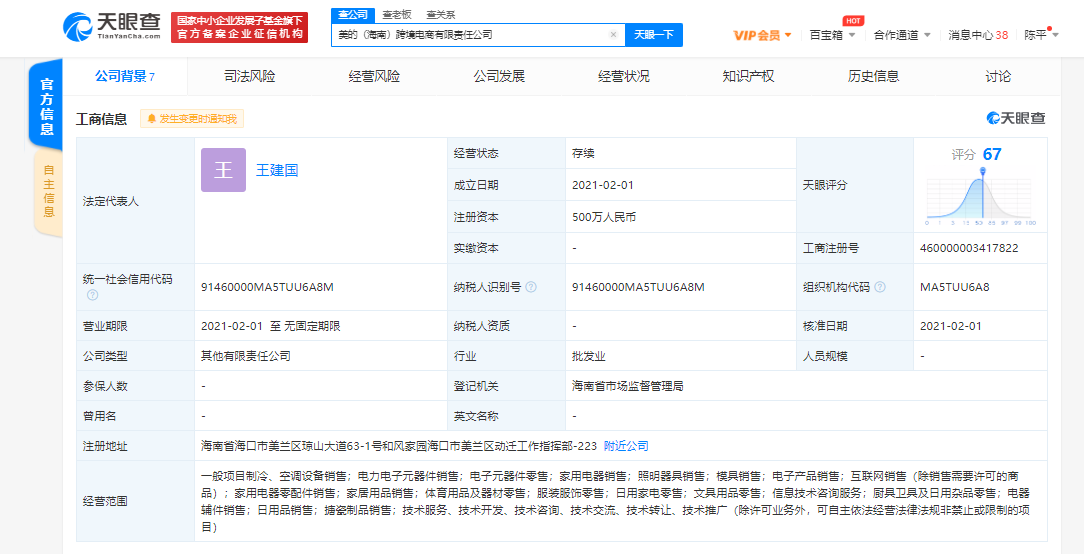 天眼查App显示,2月1日,美的(海南)跨境电商有限责任公司成立,注册资本500万元人民币,经营范围包括制冷、空调设备销售;电力电子元器件销售;电子元器件零售;家用电器销售;照明器具销售;模具销售;电子产品销售等,该公司由佛山市美的空调工业投资有限公司与美的集团股份有限公司共同持股。同日,美的投资有限公司在海南注册成立,注册资本5000万元人民币,经营范围以自有资金从事投资活动。