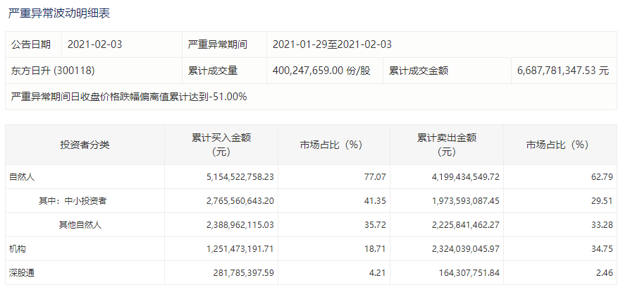 深交所盘后数据披露,东方日升1月29日至2月3日的严重异常波动期间,机构买入12.5亿元并卖出23.2亿元,深股通买入2.8亿元并卖出1.6亿元。
