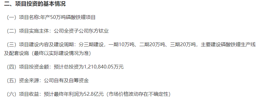 2月3日,中核钛白公告,全资子公司东方钛业拟投建年产50万吨磷酸铁锂项目,拟总投资为121.08亿元,预计最终年利润为52.8亿元。