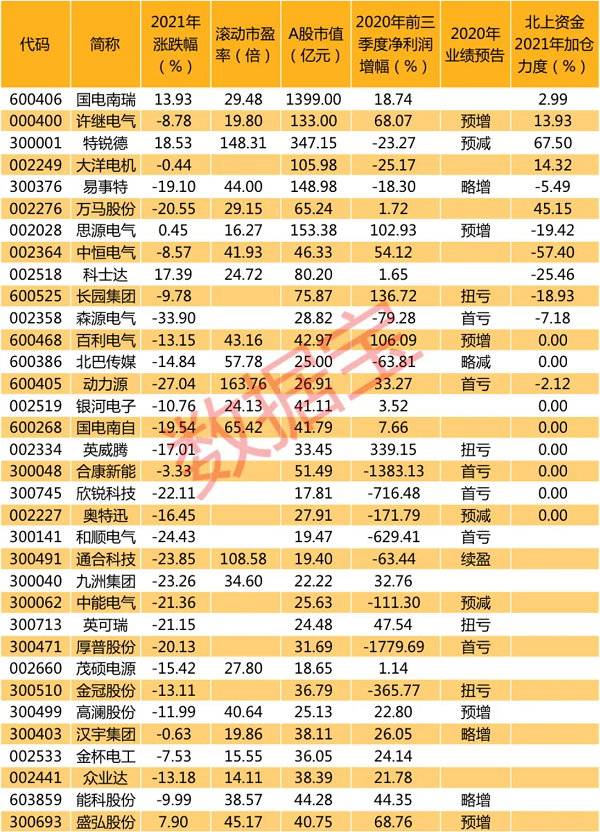 2月3日,特斯拉宣布上海超级充电桩工厂正式建成投产,代表着世界领先水平的第三代超级充电桩(V3)正式下线。特斯拉作为电动车领域的领军企业,其在充电网络上的大笔投入,或对行业发展起到引领作用。A股中,充电桩板块的概念股共34只,市值合计3313亿元,其中国电南瑞是唯一一只市值超过千亿的大市值股,市值不超过百亿的小市值股票多达28只。从业绩表现来看,同比增长个股略多于下降个股,2020年业绩预告情况也呈现类似的趋势,业绩向好股(预增、续盈、扭亏、略增)数量也略多于业绩预告下降个股。从市场表现来看,整体回调较大,仅5只概念股2021年以来股价上涨,同期的下跌股多达29只。北上资金也看好2021年充电桩板块的行情,龙头股特锐德、许继电气、国电南瑞等均受到大幅加仓,加仓力度分别为67.5%、13.93%、2.99%。(数据宝)