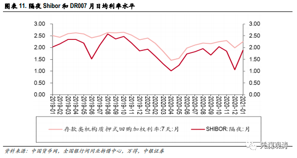 2021年1月份第四周(1月25至29日),隔夜Shibor日均为2.37%,较当月第一周(1月4至8日)的日均低点反弹了161个基点;DR007日均为2.36%,较当月第二周(1月11至15日)的日均低点反弹了59个基点,且高于7天逆回购利率2.20%(见图表12)。月末(1月29日),DR007更是收在3.16%,接近利率走廊上限7天SLF利率3.20%的水平。当日盘后,央行公开辟谣了SLF利率上调的市场传闻。