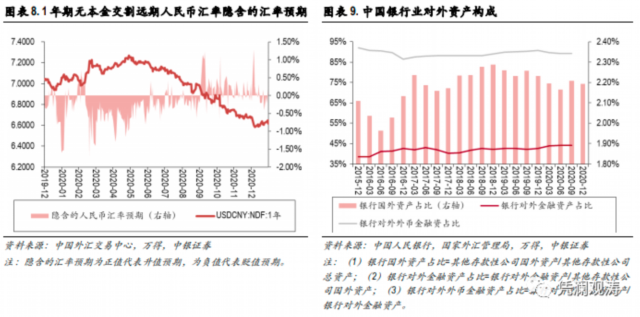 然而,第一,银行持有海外资产(包括外币资产)主要是资产多元化配置和全球化经营的需要,而不是炒外汇。并且,2020年人民币汇率先抑后扬、宽幅震荡,但市场汇率预期保持了基本稳定,全年不论升值还是贬值预期都不太强(见图表8)。