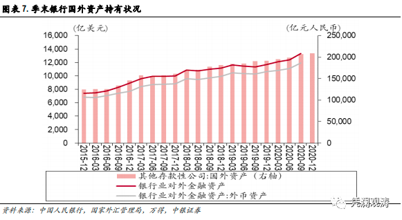 境外银行买入外汇,属于资本流出,同时还将冲抵同期因跨境人民币净流出造成我国对外负债增加。境内银行持有的这部分顺差也不会简单地被“消失”了,流量会被借记国际收支平衡表中银行部门对外资本输出增加(反映为证券投资和其他投资资产净获得负值增加),存量会被记为银行资产负债表和国际投资头寸表中银行部门对外金融资产增加。从央行统计看,2020年银行净增国外资产1.69万亿元人民币;从外汇局统计看,2020年前三季度,银行对外金融资产新增1645亿美元,其中新增外币资产1304亿美元(同期银行即远期(含期权)结售汇顺差合计802亿美元)(见图表7)。
