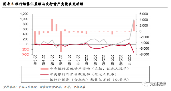 与央行外汇占款变动合计,全年央行资产折合净增134亿美元,仅相当于同期银行结售汇顺差的6.2%,杯水车薪。虽然2020年12月份,外汇占款与其他资产合计折合净增530亿美元,相当于同期银行结售汇顺差的53%,但全年仅该月合计数为正值,当年月度银行结售汇差额与央行两项资产变动额合计数之间仍为强负相关0.764。这表明前述境内外汇供过于求、央行外汇占款减少的悖论继续成立。