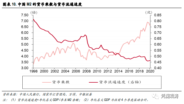 2015至2020年,央行外汇占款累计减少5.94万亿元,基础货币投放却累计增加3.63万亿元(见图表2)。同期,货币乘数由2014年的4.18倍升至2020年的6.62倍,货币乘数上升对M2增长的平均贡献率为77.9%,较2003至2014年上升了78.0个百分点(见图表4)。这显示过去六年来,货币乘数提高成为M2增长的重要驱动力。