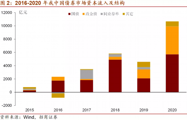 根据中债登和上清所的托管数据,2020年中国债券市场共吸引国际资本流入10670亿元,同比增长133%。2020年可以说是中国债券市场国际资本流动划时代的一年,突出体现在以下三个方面:首先是年度总流入规模超万亿,2020年中国债券市场当年国际资本流入规模达10670亿元。