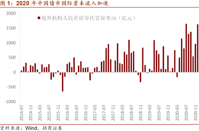 此前流入规模最大的是2018年,当年净流入5824亿元。其次是流入的同比增速最快,2020年中国债市国际资本流入同比增速为133%,较此前最快的2017年的130%高3个百分点。第三是单月净流入规模创新高,2020年7月当月债券市场国际资本流入1650亿元,较此前最高2018年6月的1104亿元多546亿元。