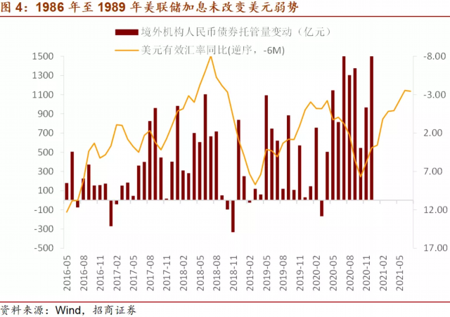 第二,美国广义有效汇率指数的走势对于债券市场国际资本流入存在6个月左右的领先作用。判断美元有效汇率在2021年将继续回落,弱美元因素持续推动国际资本流入中国债券市场。