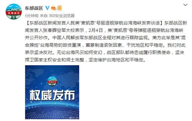 东部战区新闻发言人张春晖空军大校表示,2月4日,美“麦凯恩”号导弹驱逐舰穿航台湾海峡并公开炒作。中国人民解放军东部战区全程对其进行跟踪监视。美方此举是其“混合操控”台海局势的故伎重演,蓄意制造紧张因素、干扰地区和平稳定。我们对此表示坚决反对。无论台海风云如何变幻,战区部队都将忠诚履行职责使命,坚决捍卫国家主权安全和领土完整,坚定维护台海地区和平稳定。