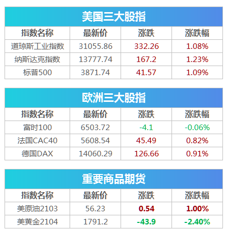 截至收盘,道指上涨332.50点,涨幅1.08%,报31056.13点;标普500指数上涨41.60点,涨幅1.09%,报3871.75点;纳指上涨167.20点,涨幅1.23%,报13777.74点。