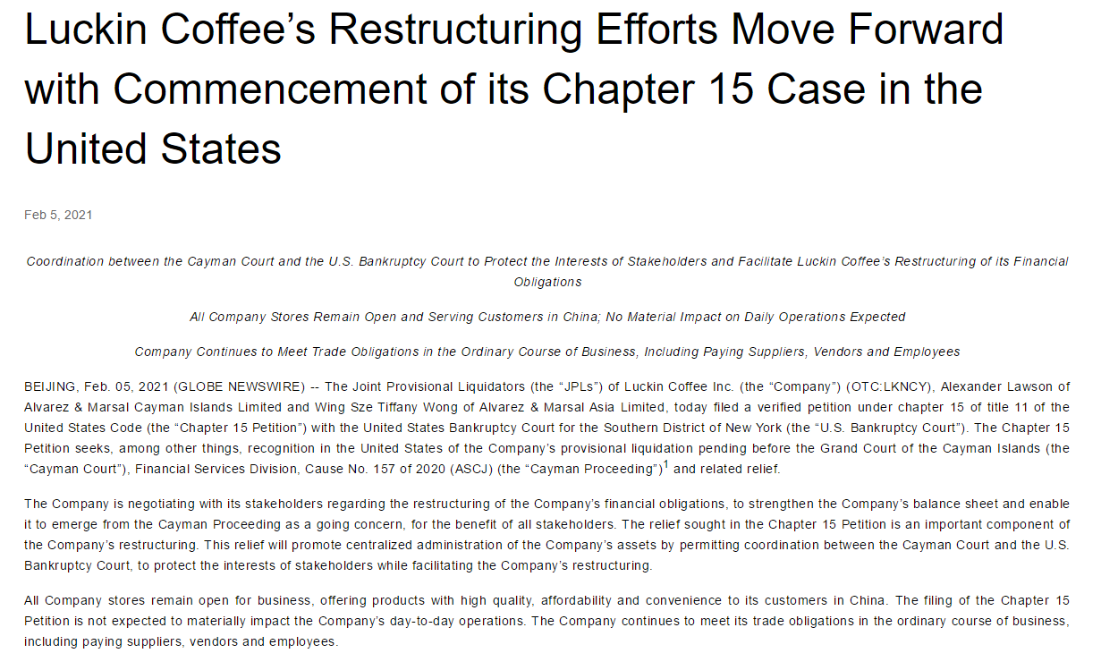 2月5日,瑞幸咖啡在其官网宣布,公司在纽约申请破产保护,公司正在与利益相关方就公司财务债务重组进行谈判。