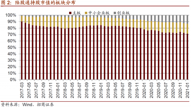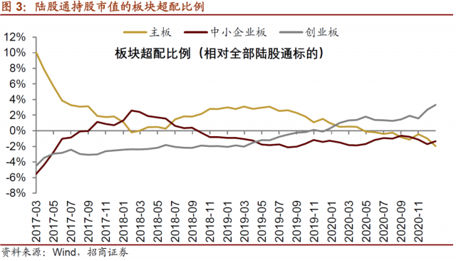 对比全部陆股通标的流通市值分布,目前陆股通持股仍超配创业板,且超配比例在1月有所扩大,超配3.31%;而主板和中小板均为低配,分别低配1.96%和1.35%,主板低配比例扩大,中小板低配比例收窄。