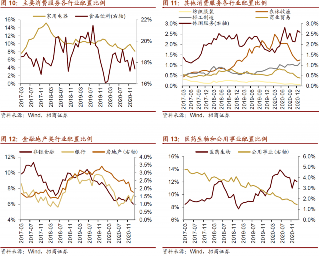 消费服务类行业中,除轻工制造和农林牧渔配比有小幅提升外,其他行业配比均有所下降。具体地,食品饮料配比下降1.04%至17.39%;家电配比下降0.78%至8.12%;商业贸易配比下降0.03%至0.39%;轻工制造配比提升0.14%至1.12%;农林牧渔配比提升0.05%至1.26%。