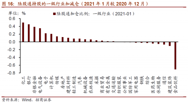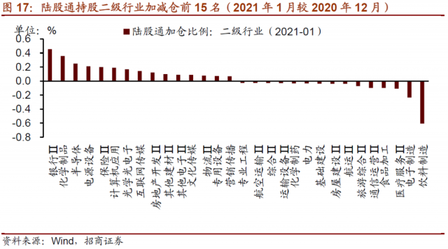 从二级行业看,2021年1月陆股通加仓比例最高的行业为银行Ⅱ、化学制品、半导体,加仓比例分别为0.45%、0.36%、0.25%,其他加仓比例较高行业还包括电源设备、保险Ⅱ、计算机应用等。减仓幅度最高的为饮料制造,减仓比例达到0.6%;其次为电子制造,减仓比例为0.23%。