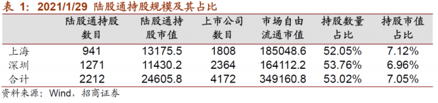 2021年1月末陆股通持股市值为2.46万亿元,较前一个月上升1206亿元;占同期A股自由流通股市值的比例为7.05%,较前期提升0.28%。具体地,2021年1月末陆股通持有的股票2212只,其中沪市持股1808只,对应市值1.3万亿元;深市持股1271只,对应市值1.14万亿元。