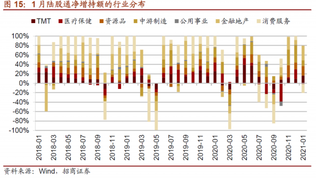 大类行业的配置方面,陆股通持股中,资源品和中游制造的配比大幅提升,TMT和金融地产配比有所提升,消费服务配比下降明显。具体地,1月末资源品、中游制造配比分别提升0.79%、0.73%至9.4%、18.5%;TMT配比提升0.28%至12.2%;金融地产配比提升0.36%至14.9%;消费服务配比下降1.76%至30.9%;医疗保健配比下降0.29%至12%。