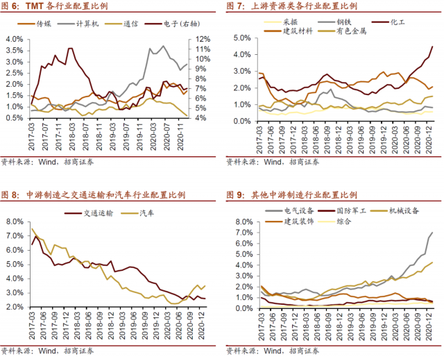 从细分行业来看,TMT一级行业中,除通信行业配比下降外,电子、计算机、传媒配比均有所提升。其中,电子行业占比提升0.14%至7.02%;传媒行业占比提升0.15%至1.71%;计算机配比提升0.11%至2.79%;通信配比下降0.12%至0.61%。