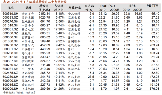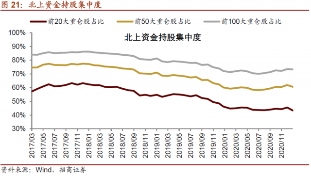 2021年1月北上资金的持股从前20向前100扩散。前20大、前50大、前100大重仓股持股市值占总持股规模的比例分别为43.38%、60.59%、73.23%,较前一个月分别变化-1.24%、0.04%和0.69%,意味着前20大重仓持股集中度下降,而前50大和前100大持股集中度提升。