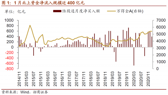 2021年1月,北上资金延续了去年末的强势状态,累计净流入400亿元,为连续第三个月大幅流入。从月内来看,前三周北上资金持续流入,月末最后一周受市场流动性短期冲击的影响,北上资金转为净流出,结束连续12周的净流入。