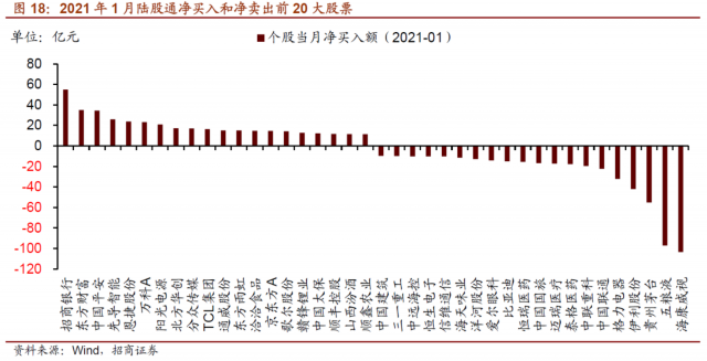 2021年1月,陆股通个股净买入规模最高的个股主要集中在金融行业,包括招商银行、东方财富、中国平安,分别净买入54.86亿元、35.04亿元34.5亿元。净卖出规模最高的主要集中在食品饮料行业和医药行业,包括五粮液、贵州茅台、伊利股份,分别净卖出97亿元、55.24亿元、42.06亿元;净卖出规模最多的为海康威视。