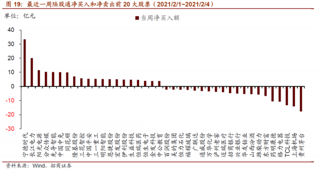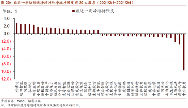 具体的,就最近一周而言,北上资金集中买入电气设备行业个股,如宁德时代、阳光电源等,分别净买入33.4亿元、11.5亿元,宁德时代也是所有个股中最近一周净买入规模最高的。净卖出规模最高的为贵州茅台、上海机场、TCL科技、格力电器、药明康德等,行业不一,净卖出额分别为17.7亿元、14亿元、13亿元、10.8亿元、10.6亿元。最近一周净增持强度最高的为科博达,净增持强度为2.77%,连续两周大幅增持;净增持强度较高的还有明洋智能、同花顺、拓斯达等。