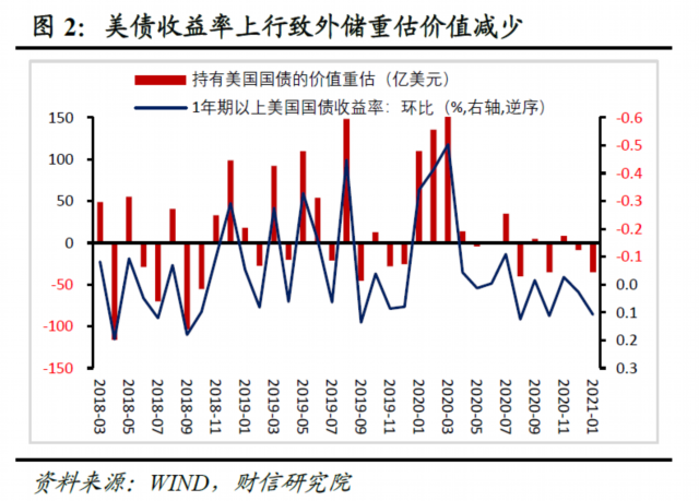 一是美债收益率上行,估值减少,致外储减少13亿美元左右。2021年1月末美国1年期以上国债收益率环比提高约0.11%,美债贬值,约使我国外汇储备减少35亿美元(见图2)。此外,还应加上1月份美国国债的应计利息收入,预计在22亿美元左右(见图3)。两项相加,共导致外储减少13亿美元左右。