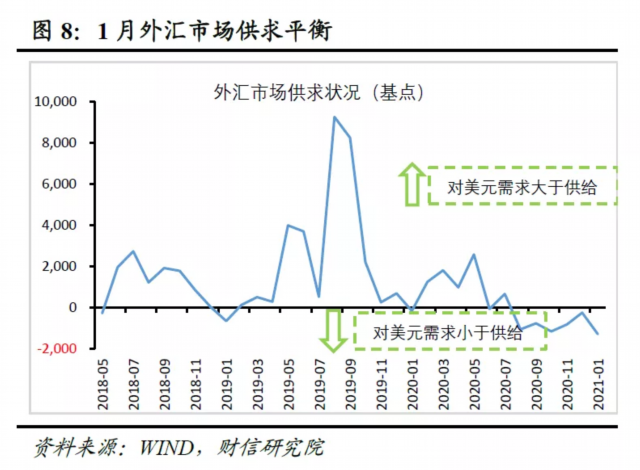 三是外汇市场供求稳定,央行干预动因不强。从跨境资金流动看,1月份外汇市场的高频监测指标显示,本月外汇市场供求稳定,国内外汇市场对美元的需求小于供给(见图8),有利于人民币汇率稳定。实际上当前人民币兑美元汇率持续升值,且人民币汇率弹性不断增强。综上,在人民币币值稳定,央行基本退出常态化干预的情况下,预计1月份央行为满足市场主体用汇需求损耗外汇储备500亿美元左右。