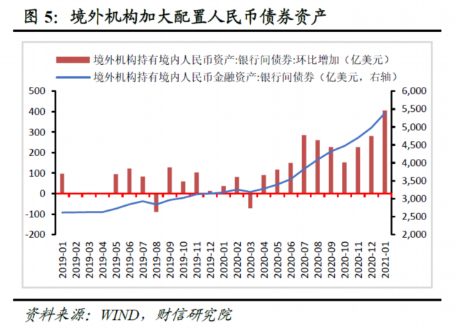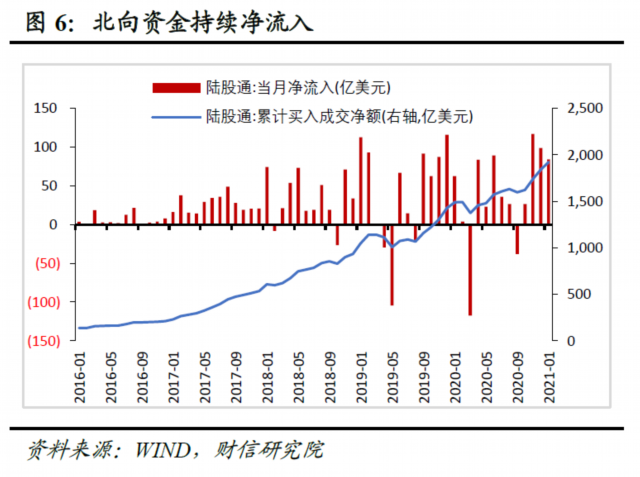 一是境外机构加大配置人民币资产,提高外储规模。1月份境外机构托管债券面额环比增加406亿美元(见图5),同期北向资金持有股票规模环比增加84亿美元(见图6),预计境外机构资产配置效应使1月外储增加500亿美元左右。