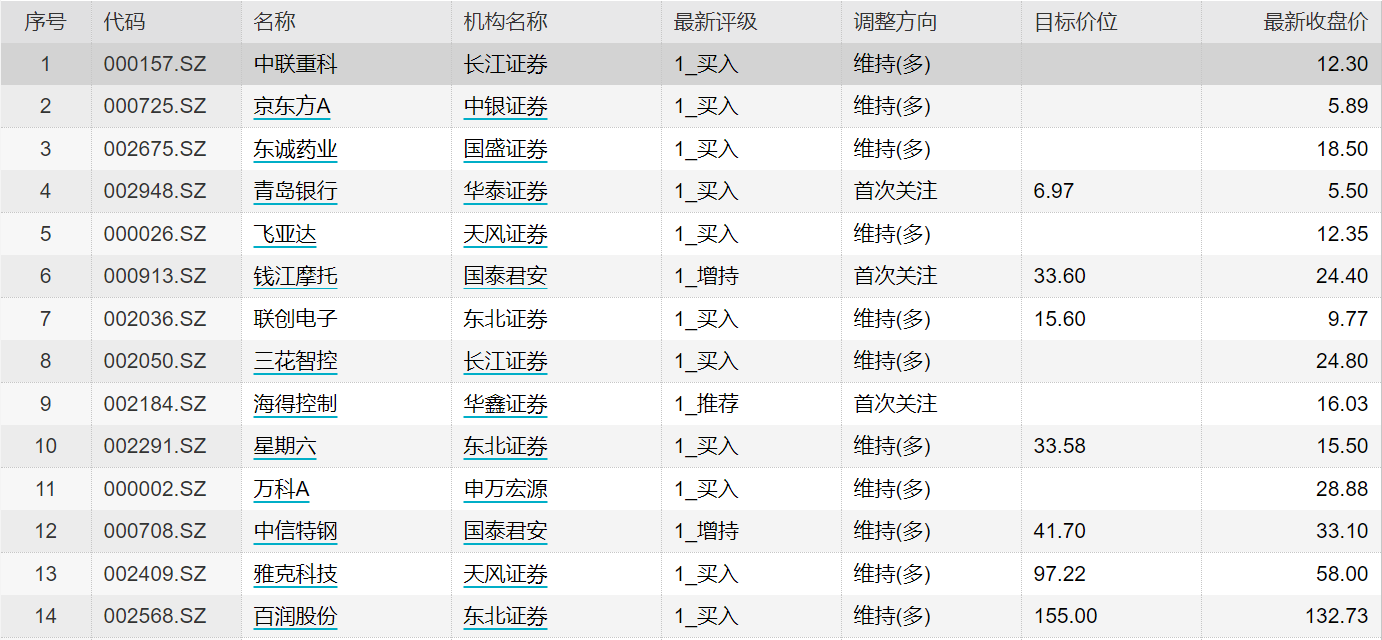 2月5日,证监会批准深圳证券交易所主板与中小板合并。海通证券表示,合并深交所主板与中小板是全面深化资本市场改革的一项重要举措,资本市场的改革进一步向纵深发展。据Wind数据统计显示,今年以来,在深交所主板和中小板中有290只个股上涨,南网能源涨幅最高,为245.05%,中瓷电子和传智教育分别涨175.08%、128.90%。近5日,两个板块中券商最新给予买入评级的个股共有59只,27股公布了目标价,其中星期六获东北证券“买入”评级,目标价33.58元,最高有117%的增长空间;钱江摩托获国泰君安“增持”评级,并给与目标价33.60元;青岛银行获华泰证券“买入”评级,并获目标价6.97元;中联重科、京东方A、东城药业等均获机构“买入”评级。