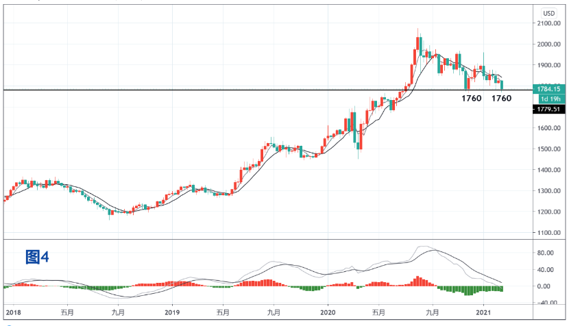 受美元反弹影响,黄金价格自2020年8月2074高点以来出现一路下行走势,当前已第二次回落到1760一线重要支撑。(见下图4)若该位无法获得支撑,金价恐出现更大幅度的调整。但从当前技术形态来看,尤其是周线级别MACD在高位死叉后持续疲软,快速线已率先跌破0轴,这种信号是市场极度疲弱的征兆,需要特别引起黄金投资者的重视。