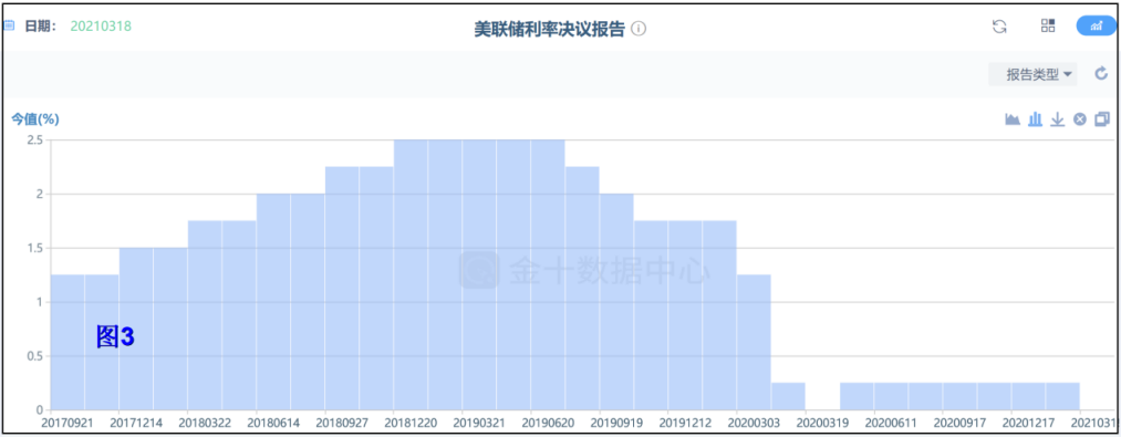 货币的涨跌最核心的是和利率相关,利率升高货币升值,利率降低货币贬值。2020年3月16日美联储最后一次降息100个基点,由3月3日的1.25降至0.25,可谓一步到位。2021年1月28日美联储公布今年第一次利率决议,继续维持0.25%基准利率不变,自此美联储已经连续八次保持利率不变。(见下图3美联储决议利率报告)