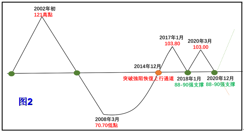 再次重申:只要美元指数未来没有效跌穿88之前,本轮美元指数牛市仍未结束。(见图2美元指数技术形态手绘图)