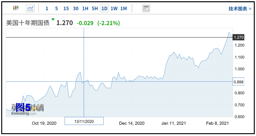 但另一方面,美国10年期国债收益率却出现了逆转迹象。截至2月18日,10年期美债收益率刷新2020年2月以来的一年高位至1.309%,不仅突破了美股盘初所创的去年3月来高点,也是近一年以来首次冲破1.30%关键位,这表明美债收益率低位反弹的势头已经确立,这对于判断全球流动性有重要的意义。(见下图5)