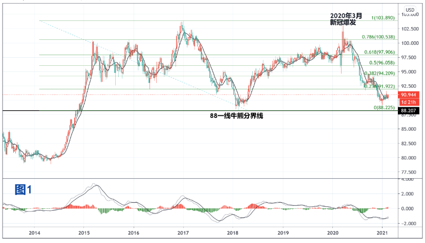作为全球货币、资产、商品的重要风向标,美元的动向将对其余各品种起到重要的参照作用。多年来,周一对于市场的理解,更注重于动作导向,即宏观基本面作为参考,市场走势才是检验正理的唯一标准。在分析美元宏观基本面之前,我们先来看一张截止2021年2月18日的美元指数周线级别技术图形。(见下图1)