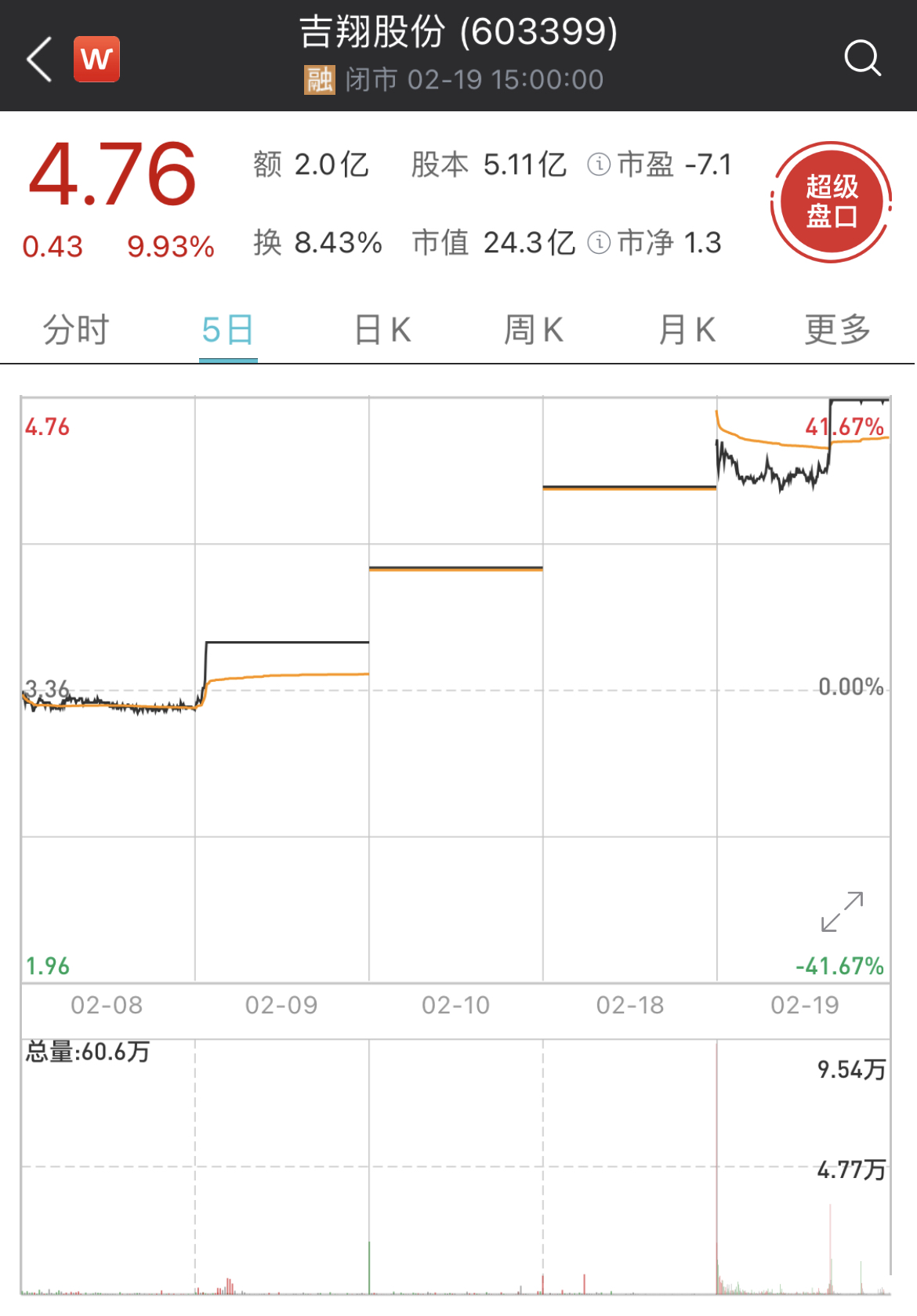 其中,吉翔股份已斩获四连板,截至2月19日收盘,该股报4.76元/股,换手率8.43%,全天成交额1.96亿元。