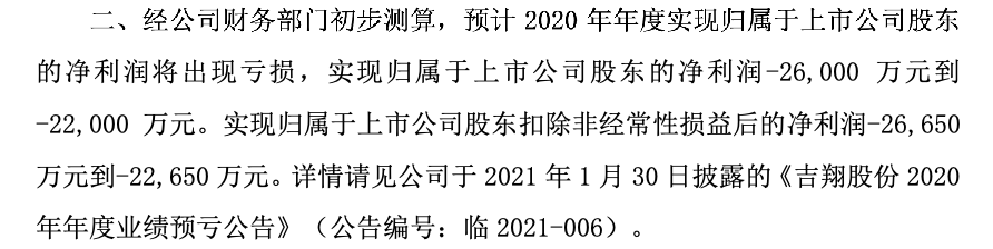 在今日发布的公告中,吉翔股份表示公司经营业绩不佳,经公司财务部门初步测算,预计2020年年度实现归母净利润将出现亏损,实现归属于上市公司股东的净利润-2.6亿元到 -2.2亿元。扣非净利润-2.665亿元到-2.265亿元。