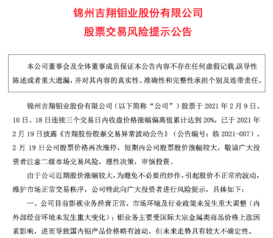 面对股价飙升,吉翔股份在盘后发布交易风险提示公告称,公司目前影视业务经营正常,市场环境及行业政策未发生重大调整;钼业务主要受国际大宗金属类商品价格上涨因素影响,进而导致国内钼产品价格略有波动,但未来走势具有较大不确定性。