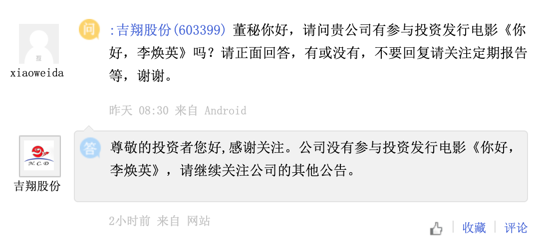 今日午后开盘,吉翔股份也曾在互动平台上表示,公司没有参与投资发行电影《李焕英》,请继续关注公司的其他公告。