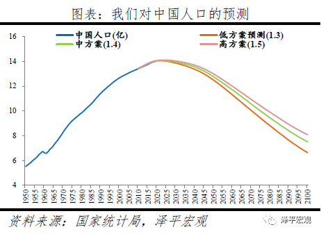 根据我们预测,按照总和生育率1.4左右的发展趋势,中国人口将在2022年前后见顶,见顶之后前25-30年内人口萎缩速度较慢,但随着高生育率时期的出生人口进入生命终点后,萎缩速度将明显变快。