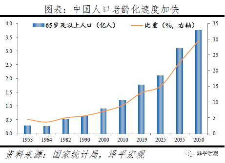 中国2001年65岁及以上人口占比超过7%、进入老龄化社会,2019年占比达12.6%,预计中国将用约21年、即于2022年前后进入深度老龄化社会,再11年后即2033年前后进入超级老龄化社会,2050年达29.5%、2060年达35.2%,老龄化速度前所未有。