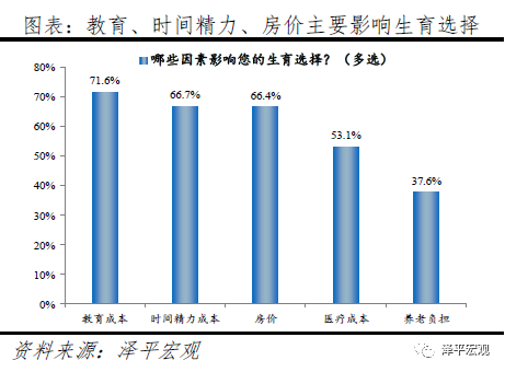 从现实看,教育、时间精力、住房是限制生育的三大因素。根据我们在微信公众号和今日头条平台的3.3万人调查,教育是影响生育行为的第一大因素,有71.6%的人选择。