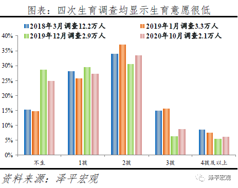 2018年3月、2019年1月、2019年12月、2020年10月我们曾先后发起四次生育意愿调查,样本总计达20.5万,但分别只有33.9%、37.1%、30.5%、33.5%的人愿意生育二孩,只有23.0%、22.6%、11.3%、14.5%的人愿意生育3个及以上孩子。